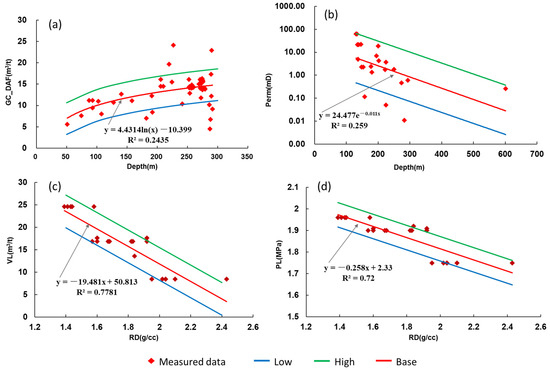 (a) Relationship between GC_DAF and burial depth, (b) relationship between permeability and burial depth, (c) relationship between VL and RD, and (d) relationship between PL and RD.
