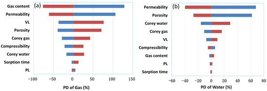 where Qs is the simulated cumulative water or gas yield of the sensitive case (m3); Qb is the simulated cumulative yield corresponding to the base case (m3); PDp is the positive yield deviation of one parameter (%); and PDn is the negative yield deviation of the corresponding parameter (%).