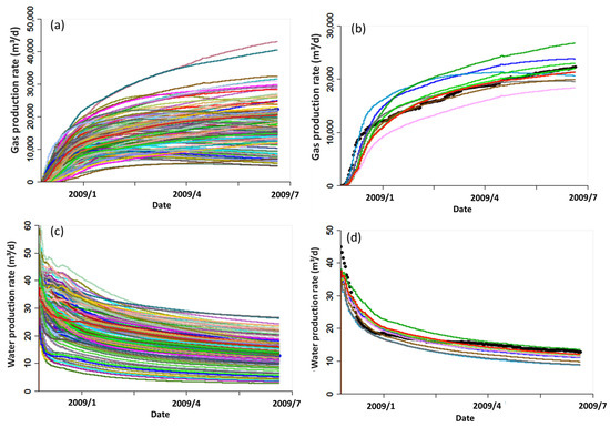 Gas rate matching results of (a) 143 cases and (b) selected 10 cases for MB006; (c) water rate matching results of 143 cases and (d) selected 10 cases for MB006.