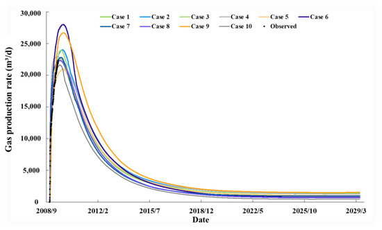 For all of these three wells, satisfied matching results are attained. In this paper, MB006 is selected as an example to illustrate this. Comparing the results from the top ten cases with the observed production data reveals a similarity between the simulated gas–water dynamic trend and the actual situation (Figure 6b,d). The SD of gas varies from −9.52% to 13.2%, as listed in Table 3.