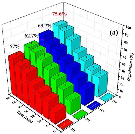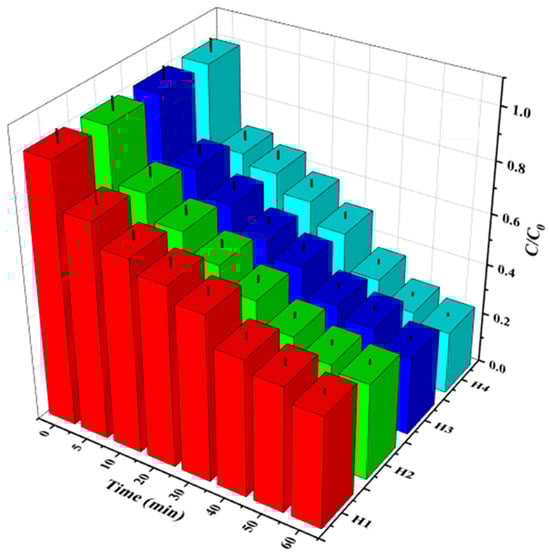 Figure 1 shows the kinetics of the variation in the C/C0 ratio of PAHs as a function of H2O2 concentration for a duration of 60 min. The first series of experiments was carried out to investigate the effect of initial H2O2 concentration on HAP degradation kinetics. The C/C0 ratios of PAHs decomposition as a function of time are shown in Figure 1. During treatment, the C/C0 ratio decreases progressively from 1 to 0.429, 0.373, 0.303 and 0.244 for samples H1, H2, H3, and H4 respectively. However, Increasing H2O2 concentration above 25 mmol/samples results in a slight increase in the rate constant 0.013 min−1 0.017 min−1 0.019 min−1 and 0.023 min−1 for the first order and 0.017, 0.025, 0.03 and 0.035 L mol−1 min−1 for the second order for samples H1, H2, H3 and H4, respectively. This increase has been reported in several works including Aleboyeh, A et al. [] and Chang, M. W. et al. []. where they attribute this to the fact that increasing the concentration of H2O2 above the optimum results in the transformation of the hydroxyl radicals to hydroperoxyl radicals, which are characterized by their lower oxidation capacity.