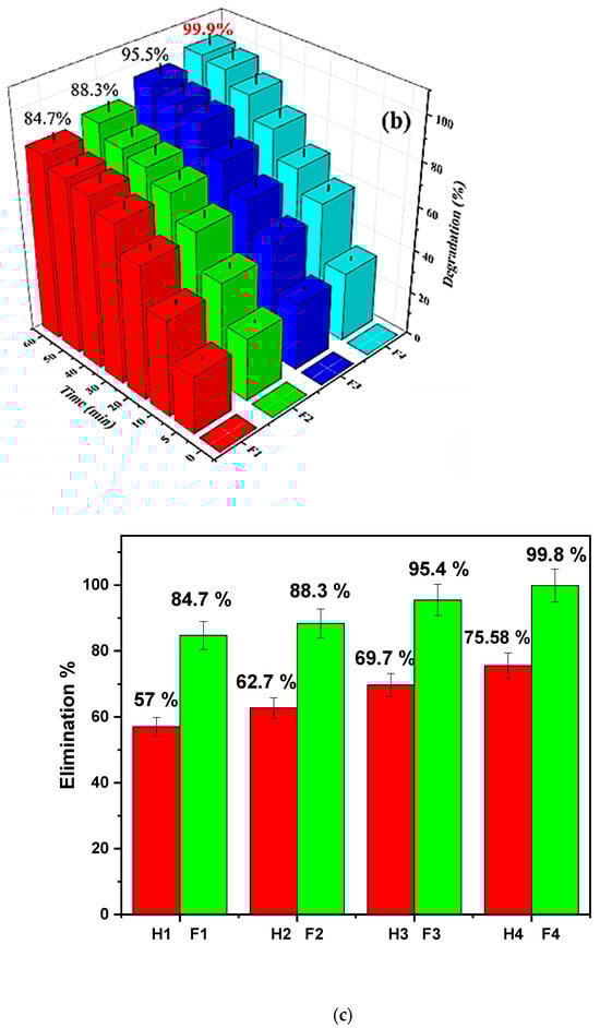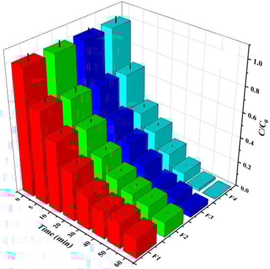Figure 2 depicts the kinetics portraying the fluctuation in the C/C0 ratio of PAHs over a 60 min duration influenced by the Fenton molar ratio. This experimental series was designed to scrutinize the impact of varying the H2O2/Fe2+ molar ratio on the efficiency of PAH decomposition, as depicted in Figure 2. The variation in the H2O2/Fe2+ ratio leads to a decrease in the concentration ratio, reaching as low as 0.0017 for sample F4. The decrease in the rate constant observed in Table 4 may be attributed to the augmented Fenton ion concentration, resulting in a diminished number of catalytically reactive sites.