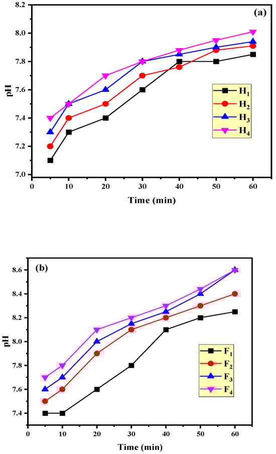The pH of the reaction system played a pivotal role in the degradation of polycyclic aromatic hydrocarbons (PAHs). The study of the initial pH effects was conducted for the reaction mixture using hydrogen peroxide, ranging between 7.1 and 8.01, as depicted in Figure 4a. As in the case of Fenton reagent utilization, a notable increase in pH from 7.3 to 8.6 was observed (Figure 4b), indicating the alkaline nature of the reaction mixture due to the production of hydroxyl ions (OH−). This suggests that an elevation in the system’s pH resulted in a substantial reduction in the elimination rate of PAHs [,,,,]. Since PAHs are a series of non-ionizable organic compounds, this pH-dependent degradation behavior could be attributed to the characteristics of the oxidant. Therefore, the pH of the reaction system emerged as a critical factor in PAH degradation, exhibiting different first-order reaction rates in both cases and leading to an enhanced elimination of PAHs. To ensure the efficient presence of catalysis at neutral pH despite the low solubility of Fe(III), iron minerals naturally occurring in soils (normally iron in its oxidized state Fe(III)) have also been used as catalysts instead of soluble iron (Fe(II)) []. The progressive solubilization of the native iron minerals allows the decomposition of H2O2 and pollutants oxidation in soils without pH adjustment [,]. Similarly, heterogeneous Fenton reactions can effectively degrade refractory organic pollutants in soils at even circumneutral pH ranges [].