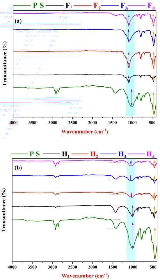 Comparing the IR spectra of polluted soil to soil treated with both oxidants underscores the equal efficiency in achieving complete hydrocarbon degradation. Peak intensity observations reveal that F is lower than PS, while in H, it surpasses PS (indicating the presence of organic OH groups). Although a small amount of [H2O2] for F1 and F2 suffices, a larger quantity is required for H3 and H4 to decrease peak intensity.