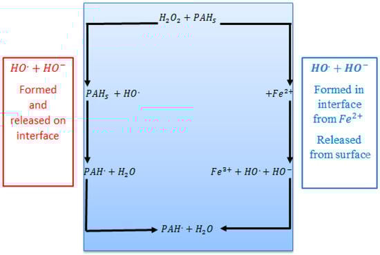 The mechanisms of polycyclic aromatic hydrocarbons (PAHs) degradation by hydrogen peroxide (H2O2) alone and the Fenton process (H2O2/Fe2+) share a common basis of highly reactive hydroxyl radicals (OH•) formation [], as shown in Figure 6. When H2O2 is used alone, it spontaneously decomposes to generate OH•, which attacks PAHs, breaking them down into smaller fragments. In the Fenton process, the addition of iron (II) (Fe2+) acts as a catalyst, promoting more efficient OH• formation. Fe2+ reduces H2O2, generating OH• and regenerating Fe2+ in the process. The OH• then attack PAHs [], leading to their degradation. Both mechanisms involve PAH decomposition by hydroxyl radicals, but the Fenton process, with the addition of Fe2+, exhibits greater efficiency in generating more OH• to accelerate the degradation process [].