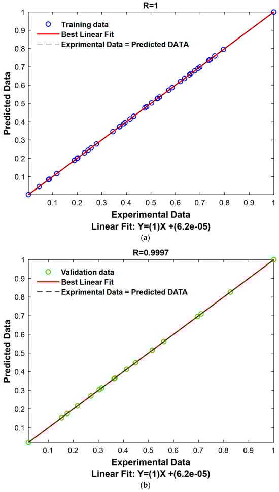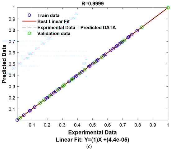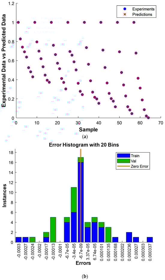 The findings underscore a compelling coherence between the experimental data and the model’s predictions (Figure 8a), affirming the robustness of the developed model. This harmonious alignment not only validates the model’s capacity to faithfully capture the intricate nuances within the dataset but also attests to its reliability in providing accurate predictions. Moreover, this alignment was further accentuated by a meticulous error analysis, meticulously illustrated through a histogram depiction (Figure 8b). Noteworthy is the discernible clustering of errors within a remarkably narrow range, confined within the interval of [−0.0003, 0.0003] (Figure 8b). This nuanced examination reveals a striking precision in the model’s predictions, with the overwhelming majority of discrepancies being minute. Such precision reinforces the model’s resilience and aptitude, bolstering its applicability across various domains.