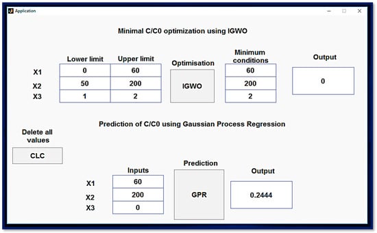 To enhance the predictive capabilities of our research, we have developed a bespoke application using MATLAB (Figure 9). This application serves the purpose of optimizing the minimization of C/C0, a critical parameter in our study, employing the IGWO algorithm. This optimization process is founded upon the robust model created through GPR, which accurately captures the underlying dynamics of the system under investigation. By integrating these advanced computational techniques, our methodology not only ensures the precision of our predictions but also provides a streamlined approach for further exploration and analysis in our research domain.