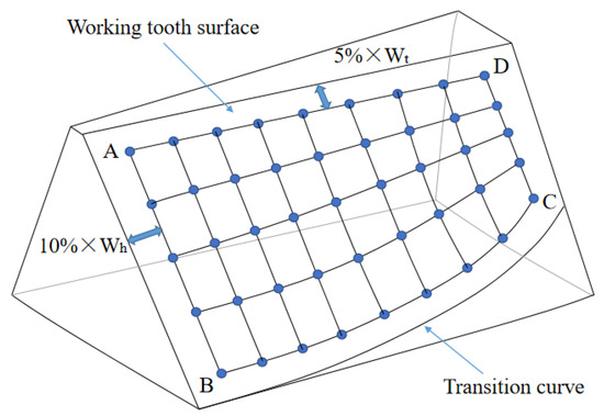 Based on this, the idea of dividing the tooth-surface sampling grid of the face gear is as follows: (1) Determine the tooth-surface-detection area; (2) The sampling points on the horizontal and vertical boundary lines were initially self-adaptive generation.
