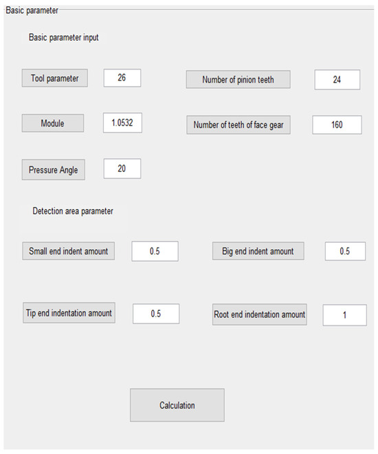 Figure 4 shows the interface of the tooth point program. The gear-tooth-surface-point-calculation program includes the input of basic gear parameters, grid planning parameters, theoretical tooth-surface point calculation, and the calculation of adaptive parameters, which provide the primary adaptive tooth-surface point. This program is illustrated in Figure 5.