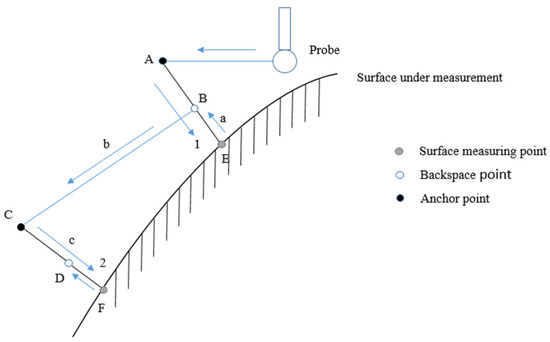 When the tooth surface is probed, the probe moves closer and then retreats along the normal vector of the measuring point. This process includes changes in probing speed, retreat speed, and movement speed. The movement path of the probe from the front measuring point to the lower measuring point is shown in Figure 6. As can be seen from the two-point detection path in Figure 4, the probe movement mainly consists of three parts, which are segment a, segment b, and segment c. It is further extended to other measuring points, where the distance between the measuring points in section a and section c is constant and only section b is different. The total operating distance of the probe is: