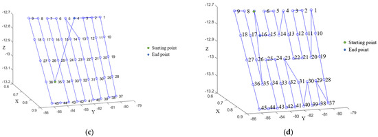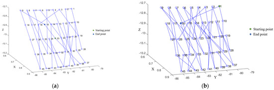 The purpose of establishing a measurement path is to detect sampling points orderly, quickly, and efficiently and to ensure that the probe will not collide during the inspection. In the actual detection, the position of the detection points, detection points, and quick fix points are fixed values. Therefore, to obtain the shortest detection path possible, it is necessary to optimize the path b segment. The objective function of optimizing the total path length is as follows: