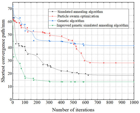 To compare the path optimization effect of various algorithms, the particle swarm optimization, simulated annealing algorithm, genetic algorithm, and adaptive genetic simulated annealing algorithm are respectively used to optimize the shortest path of the first generation of adaptive 45-tooth surfaces. Fifty experiments are carried out on each intelligent algorithm, and the average results are obtained. The optimized-detection-path distance and algorithm execution time are shown in Table 1, and the resulting path-optimization-effect diagram can be seen in Figure 8.