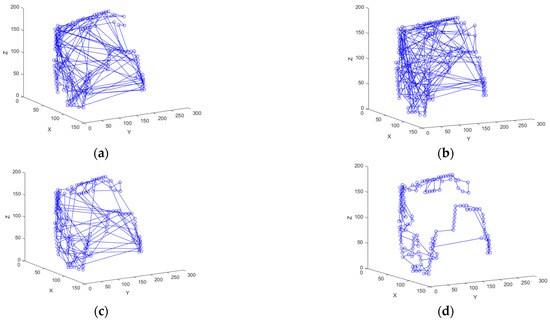 From Figure 8 and Table 3, the exploration path of the genetic algorithm is the most complex and longest, and the calculation time is relatively long. Compared with the genetic algorithm, the particle swarm algorithm has higher efficiency and less computation time, and it has a better optimization effect on the path. The simulated annealing algorithm has a small search path result, but there are crosses in the path result, which is not the best search result. On this basis, a new genetic algorithm is proposed, which has the smallest search path and the smallest convergence speed. The results indicate that, compared to the traditional simulated annealing method, this method can reduce the search route by 27.1% and 66.9%, respectively. Compared with the simulated annealing algorithm, the algorithm’s runtime is reduced by 17.2% and reduced by 60.7% compared with the genetic algorithm.