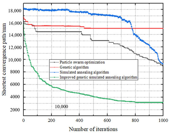 Each algorithm’s shortest path is shown in Figure 9. Although the initial convergence path of the genetic algorithm is similar to that of the adaptive genetic simulated annealing, it is susceptible to premature convergence due to parameter influences, resulting in the worst convergence results. The adaptive genetic simulated annealing algorithm greatly improves the convergence accuracy and convergence speed, and the iterative optimal solution is much higher than other optimization algorithms.