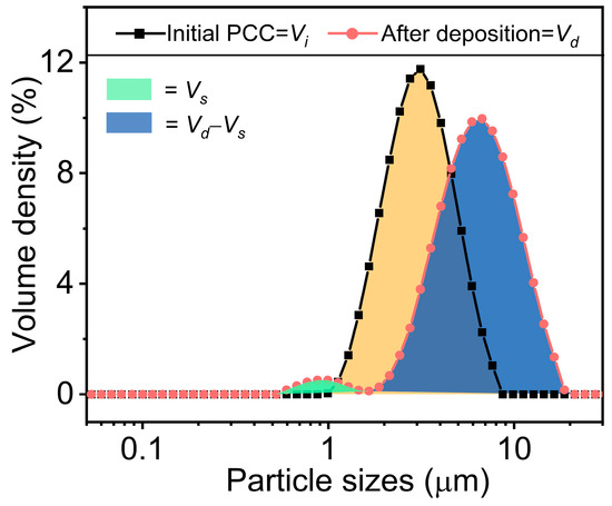 where D represents calcium deposition percentage; the subscript Tot denotes the total deposition; Ci is the calcium concentration in the initial solution; Cf is the calcium concentration in the filtrate solution; subscript Sec and Eff stand for the secondary nucleation and effective deposition, respectively; Vs is the volume of secondary nucleation particles; Vd is the volume of particles after deposition, and Vi is the volume of initial PCC particles.