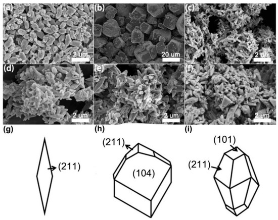 Morphologies of (a) VI, (b) SC, (c) SO, (d) HI, (e) PC, and (f) IB. Exposed crystal faces of (g) SO/HI/PC/IB, (h) SC, and (i) VI.