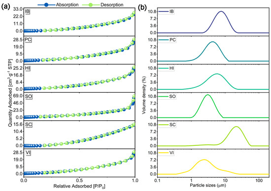The specific surface areas of six PCC types are characterized by concave adsorption isotherms without inflection points (Figure 3a). According to the IUPAC classification, they indicate the typical Type III isotherms, suggesting the nonporous or macroporous solid materials [35]. Except for the SC sample, the other samples exhibit an upward adsorption volume trend when P/P0 approaches 1, meaning a small amount of accumulated pores. The PSD spectra of PCC, displaying a unimodal distribution, are illustrated in Figure 3b.