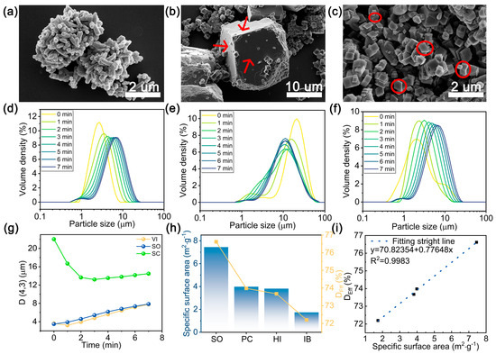 Morphologies after adsorption of (a) SO, (b) SC, (c) VI. Time-dependent PSD curves of (d) SO, (e) SC, and (f) VI. (g) D (4,3) trends of PCC. (h) Specific surface area and effective deposition of PCC. (i) Fitting of results from the image (h).