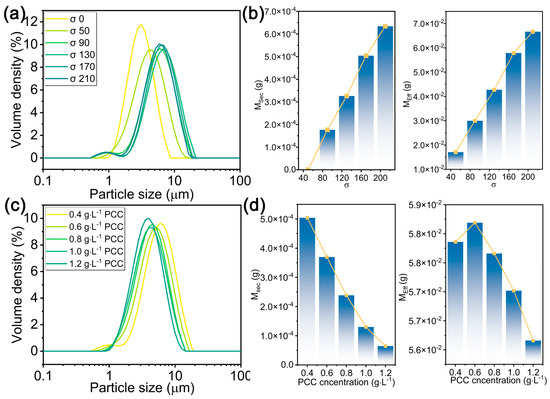 (a) PSD spectra and (b) secondary nucleation mass and effective deposition mass at different values of σ (here, the PCC concentration is 0.4 g·L−1). (c) PSD spectra and (d) secondary nucleation mass and effective deposition mass at different PCC concentrations (here, σ = 170).
