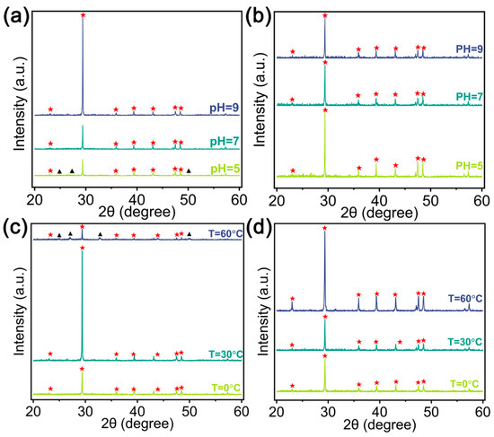 The XRD data at: (a,b) varying pH content and T = 30 °C; (c,d) varying temperature and PH = 9 (a,c) no PCC and, (b,d) PCC concentration of= 1.0 g·L−1; ★—calcite, ▲—Vaterite).