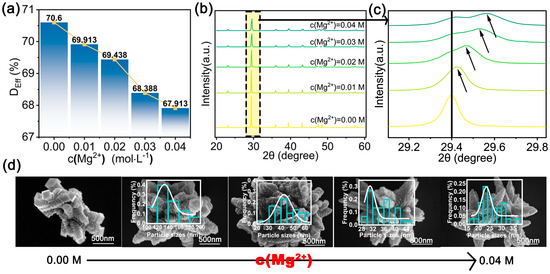 (a) Effective deposition; (b) XRD patterns; (c) XRD patterns within the (104) range; (d) Morphologies of growing crystals with different c(Mg2+) values.