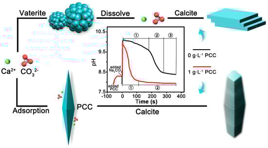 Based on the experimental results, the CaCO3 deposition mechanism following the addition of PCC was investigated. The pH variations with and without the addition of PCC are shown in Figure 9. The hydrolysis of Na2CO3 generates OH−, which leads to a rapid increase in pH from 8.3 to 10 at the beginning of both reaction pathways (R1).