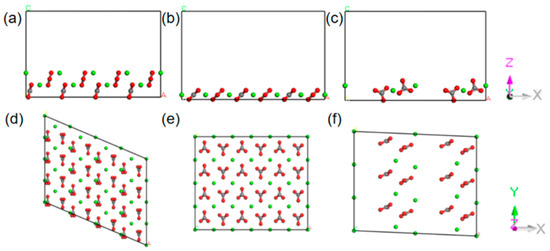 Crystal faces: (a) 101-front, (b) 104-front, and (c) 211-front. (d) 101-top, (e) 104-top, and (f) 211-top (here, green, gray and red atoms correspond to calcium, carbon and oxygen, respectively).