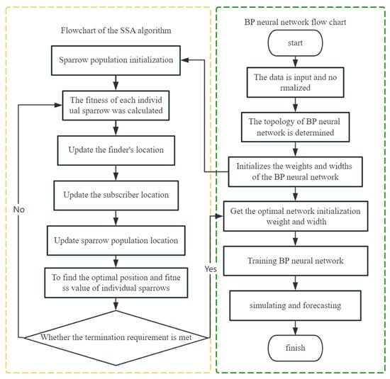 The process of optimizing the BP network via the sparrow search algorithm mainly consists of two parts: sparrow search algorithm optimization and neural network prediction. In order to optimize the sparrow search algorithm, we first determine the sparrow population. Because the weight and threshold are m × n-dimensional matrix, respectively, the vector exists in the BP neural network structure (net). In order to optimize each element, we first take out the elements, and then put them into the vector according to the order to complete the composition of the sparrow population. The length of each sparrow in the population is the sum of all connection weights and threshold lengths of the neural network. There are n neurons in the hidden layer, h neurons in the output layer, w is the weight between the input layer and the hidden layer, lw is the weight between the output layer and the hidden layer, b is the threshold of the hidden layer, and o is the threshold of the output layer. When the input layer is i, the length of the sparrow is I × n + n + n × h + h. The optimization process represented with a flow chart added via the sparrow search algorithm to optimize the BP neural network is shown in Figure 1.