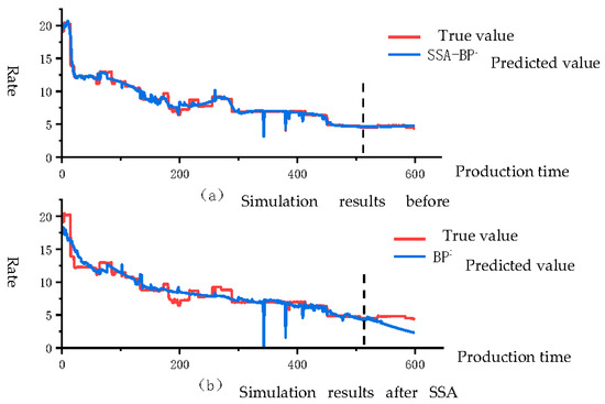 Using the single-layer BP model optimized with the sparrow search algorithm and the model without the sparrow search algorithm, the prediction effect of gas well productivity is shown in Figure 2. From Figure 2b, we can see that the network model optimized without the sparrow search algorithm has a poor fitting result in the training stage, and the predicted value of the model in the learning stage is generally lower than the real production value. This is because the selection of weights and thresholds of the model without SSA optimization is random; even if other super parameters of this model have been optimized, it is still difficult to use directly. The model optimized with the sparrow algorithm is obviously better in both the fitting effect of the training section and the test results of the test section (as shown in Figure 2b).