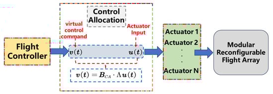The MRFA generates lift and torque by driving the propeller blades to rotate through motors, enabling motion in various directions. As there are no actuators directly generating thrust and torque in the system, the thrust produced by the motors is considered as the input vector for the actuators, and the input to sustain the motion of the flight array is treated as a virtual control input vector. Figure 2 illustrates the schematic structure of control allocation in the control system.