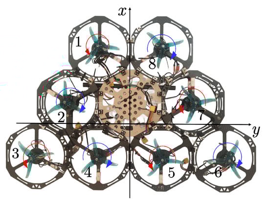 In accordance with Equation (13), the values of the control allocation matrix are solely dependent on the distribution of actuators within the MRFA and the rotation direction of the propellers. Based on the positional information of each module and the rotation direction of the propellers, the control allocation matrix for the corresponding MRFA can be determined (Figure 3). The red arrow indicates counterclockwise rotation of the propeller, while the blue arrow indicates clockwise rotation of the propeller. The Moore–Penrose pseudoinverse ultimately is employed to allocate the virtual control commands to each actuator. One has