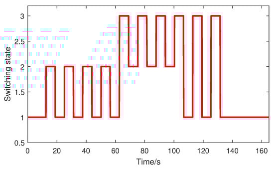 Let , from Equation (22), we obtain . When the dwell time , the switching signal is illustrated in Figure 5.