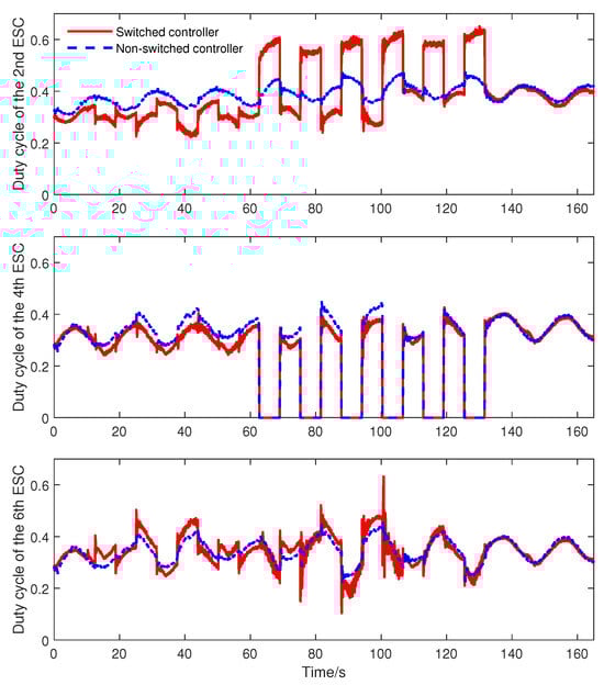 When employing different control strategies, the outputs of the actuators also undergo changes. Under the switching law depicted in Figure 5, the partial actuator output curves of the MRFA during pitch angle trajectory tracking are illustrated in Figure 9. When a state transition occurs and an actuator fails, there is an instantaneous reduction in power, leading to a sudden change in tracking error. Therefore, the actuator outputs under the two control strategies used in this paper exhibit abrupt changes. The blue dashed line corresponds to the case without using the switched controller is smoother compared to the curve with the switched controller. This is due to the fact that the arbitrary switched control redistributes the power loss caused by actuator failure due to the remaining properly functioning actuators.