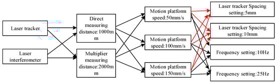 Figure 2 shows the schematic diagram of the dynamic measurement scheme. The measurement is mainly carried out from four aspects: measuring instrument, measuring distance, measuring speed, and a measurement setup mode. Measuring instruments are the laser tracker and laser interferometer; the measuring distance depends on the movement distance of the sliding table, including 1000 mm direct measurement (without a pyramid prism) and doubling it to 2000 mm (with a pyramid prism); for the sliding platform, the measuring speed can be set to 50 mm/s, 100 mm/s and 150 mm/s; the measurement setup mode is suitable for the laser tracker and laser interferometer. The laser tracker can be set in four measurement modes: 5 mm equal interval, 10 mm equal interval, 10 Hz equal sampling frequency, and 25 Hz equal sampling frequency. The laser interferometer is only available to set the frequency rather than equal interval measurement; so, there are two measurement modes. Since the dynamic repeatability of measurements needs to be analyzed, it is necessary to measure the laser tracker and laser interferometer twice at equal sampling frequencies of 10 Hz and 25 Hz, respectively. Therefore, the measurement data of 26 laser trackers and 14 laser interferometers can be obtained. The measurement environment is set as the standard environment (temperature is 20 °C, atmospheric pressure is 1013 KPa, and humidity is 50%RH).