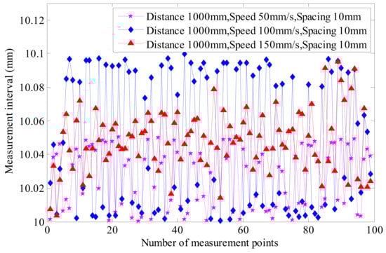 Figure 4 shows the data graph of the laser tracker at a sampling interval of 10 mm (rated distance of 1000 mm). It can be clearly seen from the figure that when the rated speed of the sliding table is 50 mm/s and 150 mm/s, the actual interval of the laser tracker is closer to the set value of 10 mm; when the rated speed of the sliding table is 100 mm/s, the actual interval data fluctuate significantly and are separated, which is consistent with the maximum standard deviation of the actual interval.