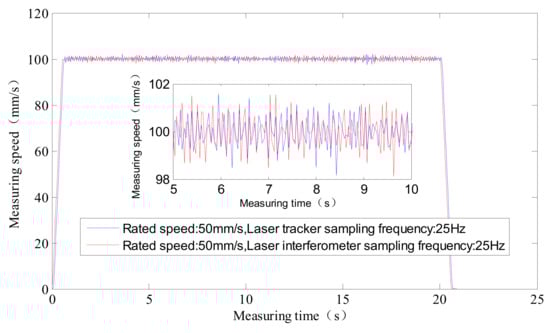 (4) When the sampling frequency of the laser tracker is 10 Hz, the local average velocity is closer to the rated speed of the sliding table. When the sampling frequency of the laser interferometer is 25 Hz, the local average velocity is closer to the rated speed of the sliding table. The local average velocities of the laser tracker are 49.9996 mm/s, 99.9993 mm/s, and 149.9997 mm/s, respectively, at 10 Hz, which are closer to 50 mm/s, 100 mm/s and 150 mm/s than 49.9982 mm/s, 99.9957 mm/s and 149.9920 mm/s.