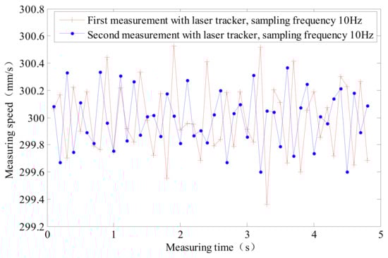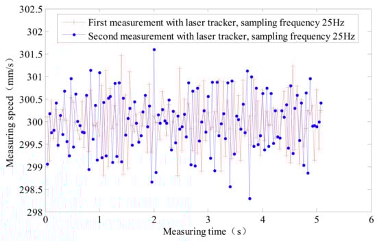 (2) The measurement repeatability of the local measuring speed of the laser tracker and laser interferometer at 10 Hz is smaller than that at 25 Hz, and the data are more stable. The repeatability of the local velocity of the laser tracker is 0.9140 mm/s at 10 Hz and 2.3600 mm/s at 20 Hz. The same is observed for laser interferometers.