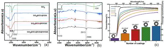 (a) FTIR spectra of the E, M, N, and pure SiO2 and (b) the corresponding enlarged curves in the range of 1500~3900 cm−1 for the E, M, N, and pure SiO2. (c) Transmittance and WCA of the E coating with different numbers of dip-coating layers.