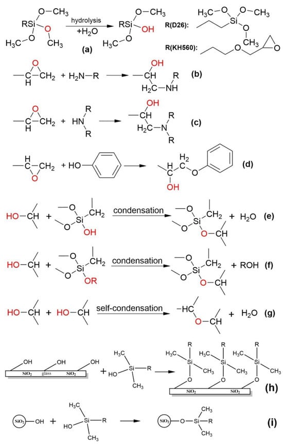 Possible reactions in the synthetic route. (a) Hydrolysis of coupling agents, (b–d) ring-opening reactions with epoxy groups, (e–g) condensation reactions, (h) reaction of hydroxyl groups on glass surface with coupling agents, (i) reaction of hydroxyl groups on SiO2 with coupling agents.