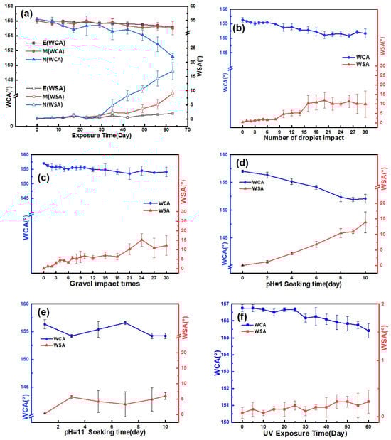 (a) The change in WCA and WSA of E, M, and N during weathering test. (b–f) The change in WCA and WSA of E coating after (b) sand impact test, (c) water droplet impact, (d,e) being immersed in corrosive liquids, and (f) UV radiation.