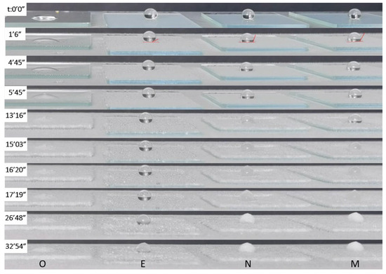 Generally, superhydrophobic surfaces with micro/nanostructures are more effective in preventing ice and frost compared to hydrophilic and hydrophobic surfaces. The underlying mechanism can be summarized as follows: Firstly, the elevated free energy barrier on superhydrophobic surfaces impedes the formation of condensation water and slows down droplet growth rate. Secondly, due to their large contact angle and small water sliding angle, water drops exhibit weak adhesion when in contact with these surfaces, allowing them to roll, jump, or fall off once they reach a certain size (critical size) [38]. Lastly, the Cassie contact between condensate droplets and superhydrophobic surfaces significantly reduces their actual contact area, leading to diminished heat transfer efficiency. This delay in heat transfer delays water droplet freezing and frost layer growth [39]. The ability to delay icing is a key parameter for evaluating ice suppression. The icing process can be divided into three stages: Heat exchange stage, quasi-adiabatic glow stage, and ice growth stage. Since the second stage is rapid, the focus is mainly on the first and third stages when assessing icing delay performance. Figure 7 illustrates the icing process of water droplets (20 µL) on E, M, N, and O (bare glass) samples. On the bare glass (O), the droplets began freezing at 285 s and completely froze at 345 s. On the M- and N-coated glass, the water droplets began freezing at 796 s and 903 s, respectively, and completely froze at approximately 932 s and 1087 s, indicating that both the M and N coatings can delay icing on glass surfaces. The icing delay time on the coated glass is about 2.7 and 3.5 times longer than that on the bare glass. Remarkably, on the E-coated glass, the water droplet started freezing at 1608 s and completely froze at 1974 s, resulting in an icing delay time approximately 5.7 times longer than that of the bare glass.