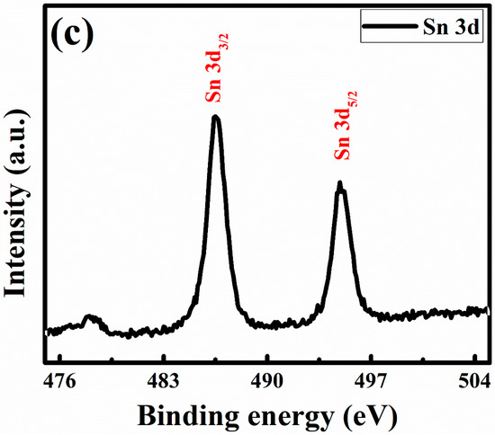 The peak centered at 495 eV is attributed to Sn-O bonding. It can be assumed that the O 1 s peak appeared because the grain surface of the SnSe thin film was exposed to oxygen in laboratory conditions. The XPS results agree with the conclusions reported for high-performance n-type SnSe synthesized by the arc-melting technique [39].