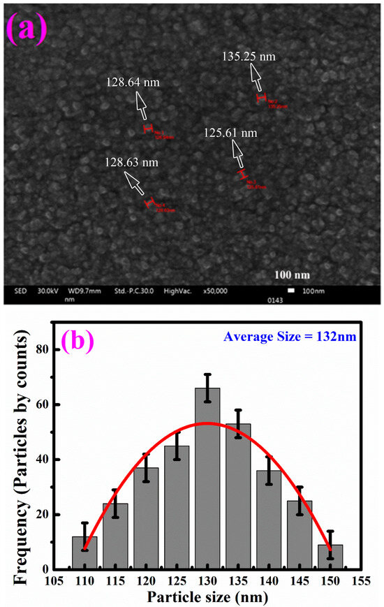 The morphological investigations of the prepared SnSe thin film were carried out using FESEM. From the FESEM image in Figure 5a, it is detected that the deposited thin film is uniformly deposited on the whole surface and is smooth without cracks. Furthermore, the micrographs of the thin films exposed almost regular nano-sized granular shape grains closely packed together to form bigger spherical structures. The grain size dispersion exposed that the average size is 132 nm, as measured with ImageJ software and shown in Figure 5b.