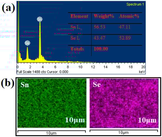 EDX analysis of (a) SnSe thin film and (b) elemental mappings of SnSe thin film with elements of Sn and Se.