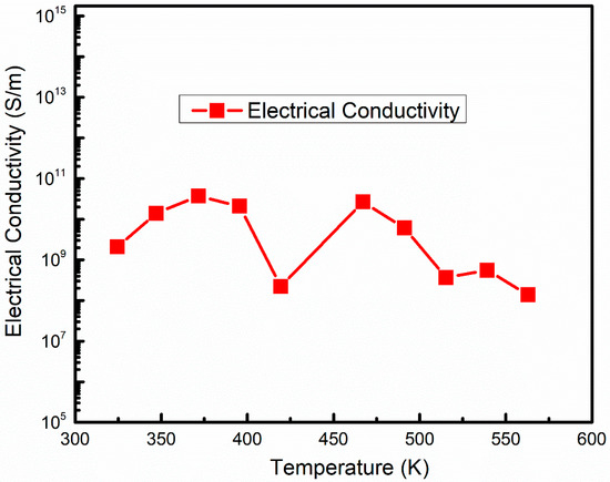 The electrical resistivity and Seebeck coefficient were measured through ZEM-3 simultaneously from room temperature to ~600 K. The thin film demonstrates decreasing electrical conductivity values with the increase in temperature as shown in Figure 7. This behavior suggests the semimetal conducting behavior of the thin film.