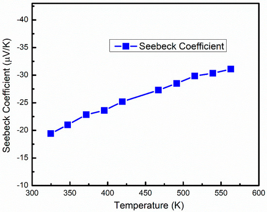 The temperature-dependent Seebeck coefficient of the thin film is shown in Figure 8. The negative sign of the values suggests that most of the charge carriers are composed of electrons. The absolute values of the Seebeck coefficient increase with temperature. The highest value of the Seebeck coefficient is ~30 µV/K. Our values of the Seebeck coefficients are substantially lower than the reported values in the literature for this thin film [46].