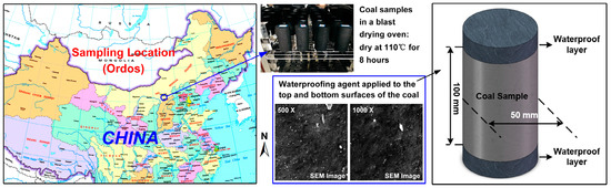 The coal samples used in this study were obtained from the Chahasu Coal Mine in the Shendong Mining District, Ordos, China, as shown in Figure 1. The 3-1 coal seam is the main mining seam of the Chahasu coal mine. Part of the coal body in this mine has been used as a dam and partial storage structure for the underground water reservoir. The type of coal chosen was bituminous coal, with a depth of burial of 340 m. Following the requirements of the International Society of Rock Mechanics, the raw coal was machined into standard cylindrical specimens of Φ 50 × 100 mm under the premise of maintaining integrity, with the non-parallelism not exceeding 0.05 mm at both ends and the axial deviation not exceeding 0.25°. Notably, none of the coal samples selected for the experiments exhibited significant fissures. An X-ray diffraction test of a coal sample showed that it was mainly composed of quartz, sodium feldspar, calcite, kaolinite, and chlorite. Chlorite, when exposed to water, is known to enhance the adsorbed water film, leading to an expansion in the volume of coal samples. In contrast, silicate minerals like calcite exhibit strong water absorption properties and plasticity, thereby influencing water absorption characteristics [38]. Environmental scanning electron microscopy complemented this analysis by illustrating the microscopic components of the coal samples, which contained significant proportions of vitrinite. The microstructure was microgravel, and the surface was relatively uniform and dense [39]. The porosity and dry density of the coal sample were 9–11% and 1380 kg/m3, respectively.