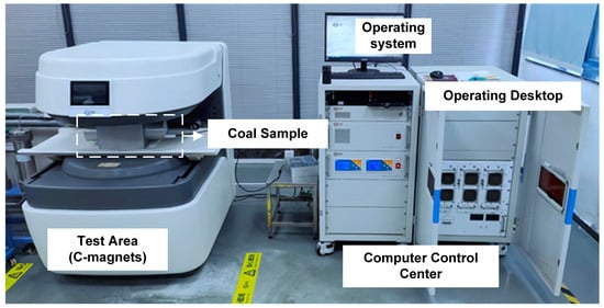 A low-temperature and high-pressure nuclear magnetic resonance system (MacroMR12-150H-I, Suzhou Newmark Analytical Instruments Co., Ltd., Suzhou, China) was used to test the spatial distribution characteristics of water in the coal samples (Figure 2). The system consists of a controller, spectrometer system, RF unit, and gradient unit with a magnetic field strength of 0.5 T ± 0.08, resonance frequency of 21.3 MHz, RF pulse of 2–49.9 MHz, and RF accuracy of 0.01 Hz. The basic principle behind the use of NMR in this study is to characterise the properties of hydrogen-containing fluids in coal rocks by monitoring the relaxation behaviour of the nuclear spin of 1 H as it interacts with external magnetic and radiofrequency fields, as previously described [40,41]. In this study, the spatial distribution characteristics of water in coal samples were analysed by magnetic resonance imaging (MRI) using Carr–Purcel–Meiboom–Gill (CPMG) test sequences.