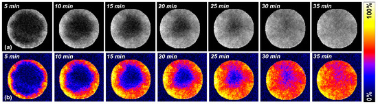 Radial NMR images of coal samples at different immersion times. Intensity of pixel colour corresponds to water content. (a) Original image/uniform mapping, (b) pseudo-mining.