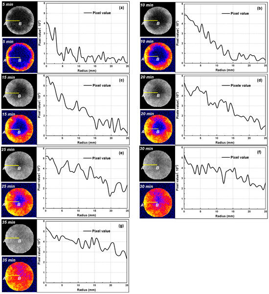Pixel representations of water absorption degrees of coal samples at different immersion times. (a) t = 5 min; (b) t = 10 min; (c) t = 15 min; (d) t = 20 min; (e) t = 25 min; (f) t = 30 min; (g) t = 35 min.